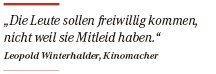 Im ehemaligen „Kurkino“ hängen schon lange keine Filmplakate mehr, dort wirbt heute der Supermarkt „Markant“, auf dem Parkplatz drehen sich die Spieße der Hendlbraterei „Hahn im Korb“. Anfang der 70er-Jahre hat Leopold Winterhalder im „Kurkino“ seine ersten Kinoerfahrungen gesammelt. Er lacht. „Welcher Film das war –wenn ich’s wüsste, würd’ ich’s nicht sagen. Irgend so ein japanischer Monsterfilm.“ Das Filmvorführen hat Winterhalder sich in Lenzkirch zeigen lassen, die Rollen tauscht er schon mal mit Kenzingen, und ein Teil seiner Stühle stammt aus dem Bugginger Kino: Man kennt und hilft sich untereinander. Gerade anfangs war das hilfreich, als es genug Schwierigkeiten gab – und Vorurteile. „Da hat’s dann geheißen, in Neustadt reißen dauernd die Filme oder man sieht nur den halben Film“, ärgert sich Winterhalder. „Ich weiß nicht, wo das herkam.“ Sein Kino muss sich vor denen in der Stadt nicht verstecken. „Die Leute sollen freiwillig kommen, nicht weil sie Mitleid haben.“ Winterhalder hat das Foyer in einem warmen Gelb gestrichen und für indirekte Beleuchtung gesorgt. Das muffige Kassenhäuschen unter der Treppe benutzt er nicht. „Ich hab’ einmal drin gesessen, bei Harry Potter“, erinnert er sich. „Ich kam mir vor wie’n Depp.“ Seit er das Kino übernommen hat, gibt es eine freundliche Holztheke. Dort macht Winterhalder Popcorn und Kaffee, es gibt Süßigkeiten und eine kleine Weinauswahl. Auf dem Plüschsofa und an einigen Bistrotischen können Besucher vor oder nach dem Film zusammensitzen. Winterhalder hat Dolby-Digital- und Surround-Klang-Systeme angeschafft, „das haben die Leute auch gemerkt“, sagt er zufrieden. „Kino soll besser sein als zu Hause.“ Seit 2004 gibt es neben dem großen Saal mit 146 Sitzen noch das „Krönli“, vor dessen Leinwand 35 Zuschauer Platz finden. Zusammen mit einem befreundeten Betonbauer hat Winterhalder selbst geschaufelt und gebaggert, so ist das auf dem Land. Wer in Deutschland neue Filme zum Bundesstart bekommen will, muss sie drei Wochen am Stück zeigen und zwar jeden Abend. „Wenn ich nur einen Saal habe und drei Wochen lang das Gleiche spiele, wird es nicht nur für mich, sondern auch für das Einzugsgebiet hier langweilig“, weiß Winterhalder. Über 400 Filme starten jedes Jahr in Deutschland, seit Jahren sinkt die Anzahl der Kopien, die die Verleiher pro Film in Umlauf bringen. Weil sie mehr Umsatz machen, werden die Filmpaläste in den Großstädten bevorzugt bedient. „Das ist schon logisch“, findet Winterhalder, „aber wenn ein Film nur mit 300 Kopien startet und dann noch gut läuft, dann gibt ihn natürlich kein Kino ab. Wenn er schlecht läuft, dann krieg’ ich ihn, aber dann will ich ihn ja vielleicht gar nicht unbedingt.“ Seit Winterhalders Umsatz und Renommée gestiegen sind, ist auch sein Programm aktuell. Sein eigener Lieblingsfilm bleibt trotzdem ein Klassiker. „Jeder Filmvorführer liebt Cinema Paradiso“, schwärmt er. Der italienische Streifen aus dem Jahr 1989 ist eine Liebeserklärung an das Kino, speziell an das in der Provinz. „Wenn du von hier oben siehst, dass das Kino voll ist und die Leute lachen und sich amüsieren“, sagt der alte Alfredo am Projektor, „dann bist du eben auch zufrieden.“ Leopold Winterhalder erinnert sich an die Premiere von „Wie im Himmel“ und klingt ganz ähnlich: „Alle Altersschichtenwaren da, und alle kamen gerührt aus dem Saal. Zwei Damen haben sich extra bedankt bei mir, obwohl ich ja nichts dafür kann. Das ist dann das Schöne am Beruf.“ 5,50 Euro kostet der normale Eintritt; bei Familien und Älteren ist das „Krone-Theater“ eine beliebte Institution. Die jungen Leute dagegen fehlen, besonders am Wochenende. „Wenn man die ganze Woche auf dem Dorf hockt, will man am Wochenende in die Stadt“, da macht sich Winterhalder keine Illusionen. Aber es gibt auch die umgekehrten Fälle: „Wir haben Leute, die aus Freiburg kommen, weil ein Film hier noch läuft. Man hat keine Parkplatzsorgen, der Eintritt ist günstiger, und der letzte Zug fährt auch erst um zwanzig vor elf zurück.“