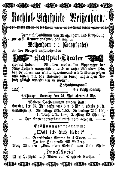 Die erste Filmvorführung wurde in der Lokalzeitung für den 24. Mai 1919 angekündigt; "Wie schon gemeldet wird unter dem Namen ,Rothtal- Lichtspiele' ein Kino- Unternehmen dahier ins Leben gerufen. Heute Samstag abends 8 Uhr findet nun die Eröffnungsvorstellung statt. In diesen bewegten Zeiten wird es mancher als eine Wohltat empfinden auf eine kleine Weile eine Zerstreuung und köstliche Unterhaltung zu finden. Möge dem Unternehmen stets ein volles Haus beschieden sein."5