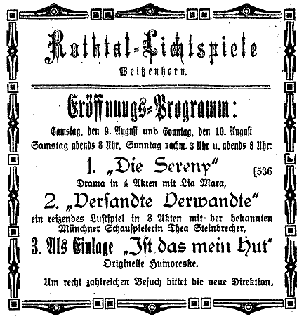 Am 1. Juni 1919 war es dann endlich soweit. Zur Eröffnung der Rothtal- Lichtspiele standen auf dem Programm das Drama Prozeß Hauers und das Lustspiel Adolars Bühnenlaufbahn: "Nachdem nun alle technischen Schwierigkeiten behoben sind, verspricht die kommende Vorführung mit ihrem abwechslungsreichen Programm sehr viel, weshalb sich ein Besuch gewiß lohnen dürfte. Selbst der verwöhnteste Kinobesucher mußte bei der Erstaufführung am Sonntag sein vollstes Lob aussprechen."7